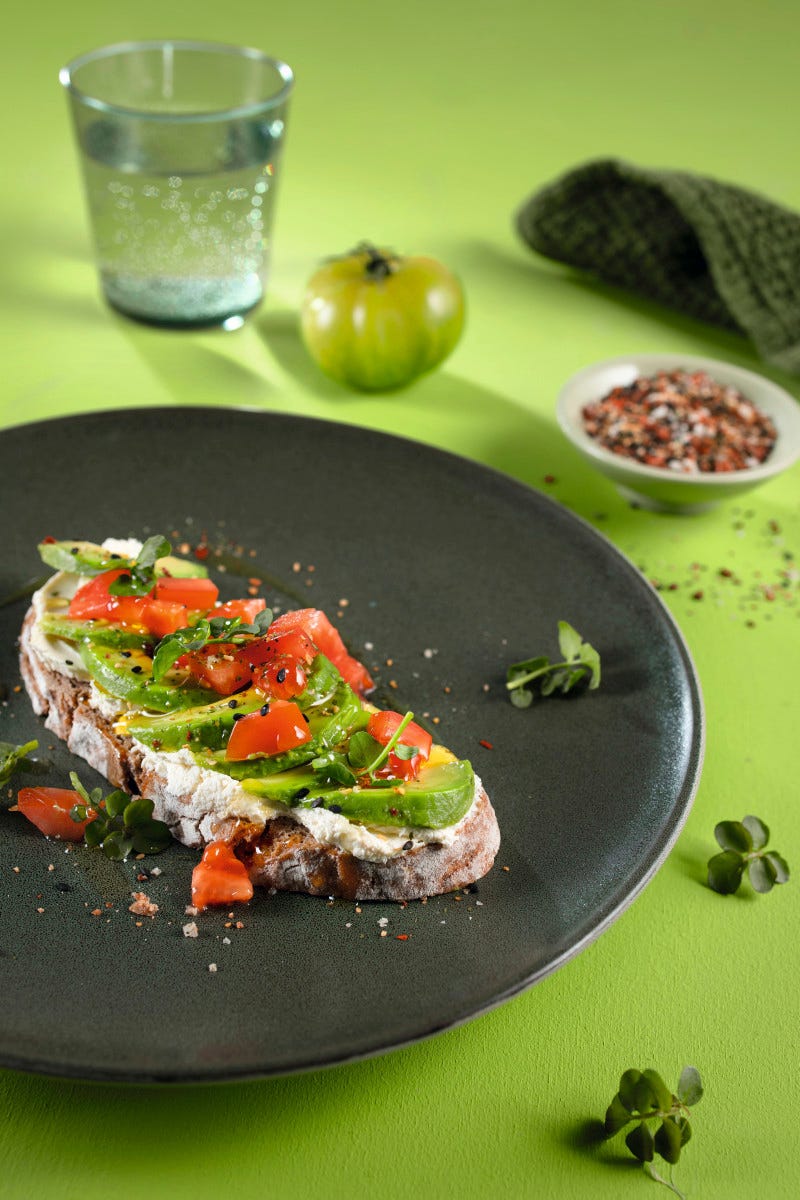 4 Scheiben Schwarzbrot, 2 Tomaten, 4 EL Frischkäse, 2 Avocados, 1 Pkg Kresse, 2 EL Olivenöl