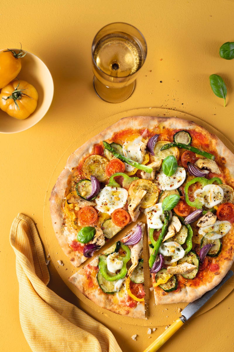 300 ml Wasser, 15 g frische Hefe, 1 TL Zucker, 400 g glattes Mehl, 120 g griffiges Mehl, 3 EL Oliven-Öl, 1 TL Salz, 250 ml gehackte Tomaten aus der Dose, ½ gelber Zucchini, ½ grüner Zucchini, 8 eingelegte Artischocken, 16 Kirschtomaten, 1 grüner Paprika, 1 gelber Paprika, 1 rote Zwiebel, 12 grüne Spargel, 4 Mozzarella, 4 EL Oliven-Öl