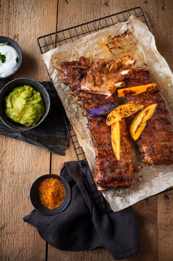 Spareribs mit Kartoffelspalten, Guacamole und Sourcream